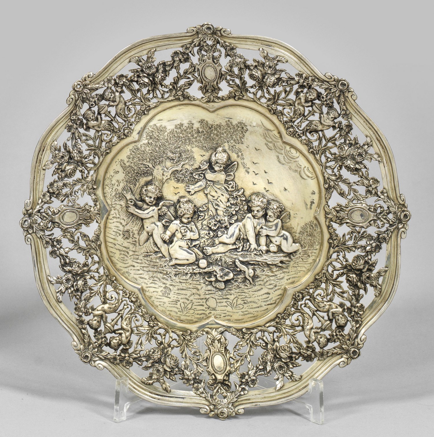 Hanauer Zierteller Silber. Runde Form. Die Fahne mit reichem Putten- und Blumendekor in Durchbrucharbeit und geschweift profiliertem Rand. Im Spiegel reliefplastisch gearbeitete Darstellung von drei Mädchen und drei Jungen als geflügelte Putten, sich vor einer Schlange fürchtend. Im Hintergrund eine ziselierte Landschaft mit Vögeln, Bäumen und Blumen. Gest. 800, Herstellerzeichen. Gew. ca. 522 g. D. 29 cm.