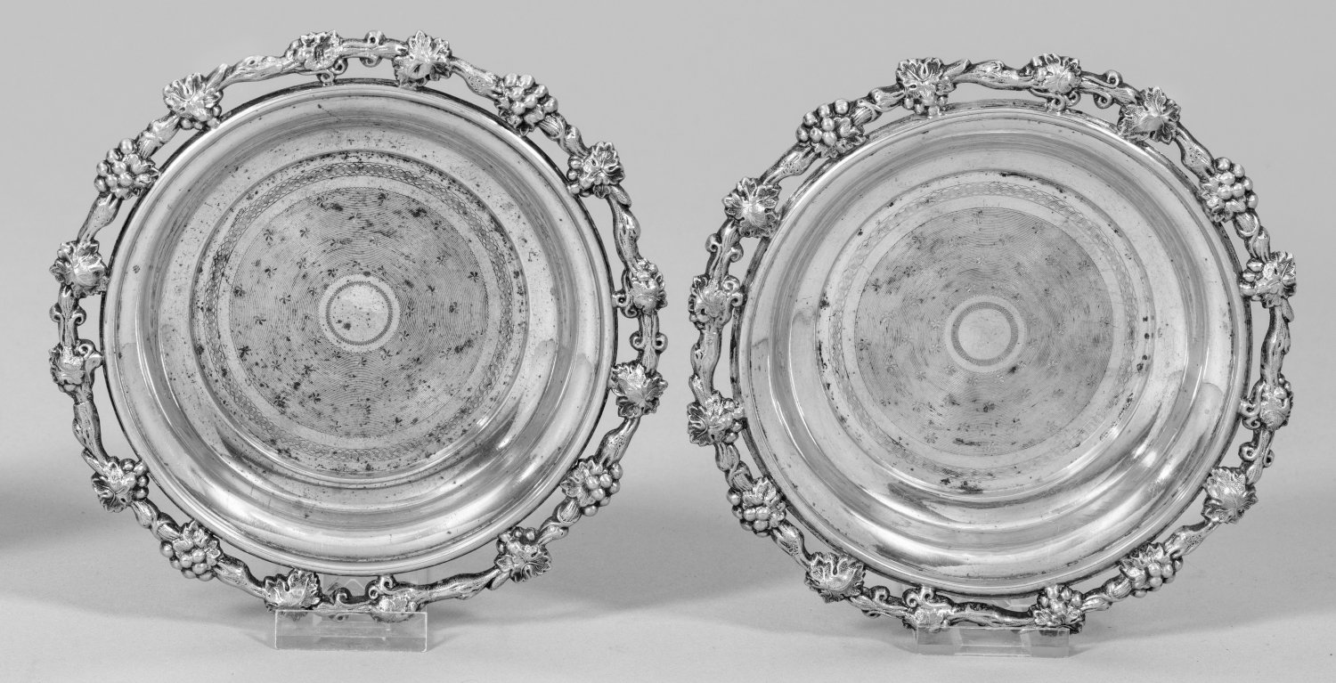 Paar Flaschenuntersetzer Silber. Runde, mittig gemuldete Form. Abgesetzter, geweiteter Rand, durchbrochen gearbeitet, in Form einer reliefplastischen, umlaufenden Weinranke mit Blättern und Weinreben. Der Spiegel verziert mit fein ziseliertem Blüten-, Linien- und Wellendekor. Minim. Gebrauchsspuren. Gest. 750. Herstellerzeichen. Gew. zus. ca. 214 g. D. 16,5 cm.
