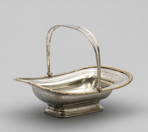 Henkelkorb Plated. Rechteckig mit gerundeten Ecken. Über gekehltem, rechteckigen Stand ein weit ausschwingender, tief gemuldeter Korpus mit beweglichem, durchbrochen gearbeitetem Henkel. Der Rand leicht getreppt in godroniertes Band übergehend. Minim. Gebrauchsspuren. H. 10 cm. 25 cm x 31 cm.