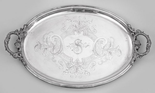 Großes Tablett Plated. Oval. Im vertieften Spiegel von Blattranken und Mäanderfries gerahmte Monogrammkartusche. Hochgezogene Griffe aus reliefplastischen Blattvoluten und Blüten. Gem., Herstellerzeichen. 67 cm x 42 cm.