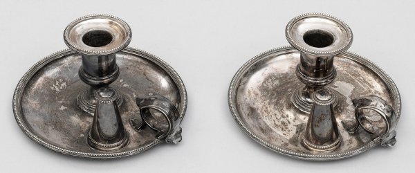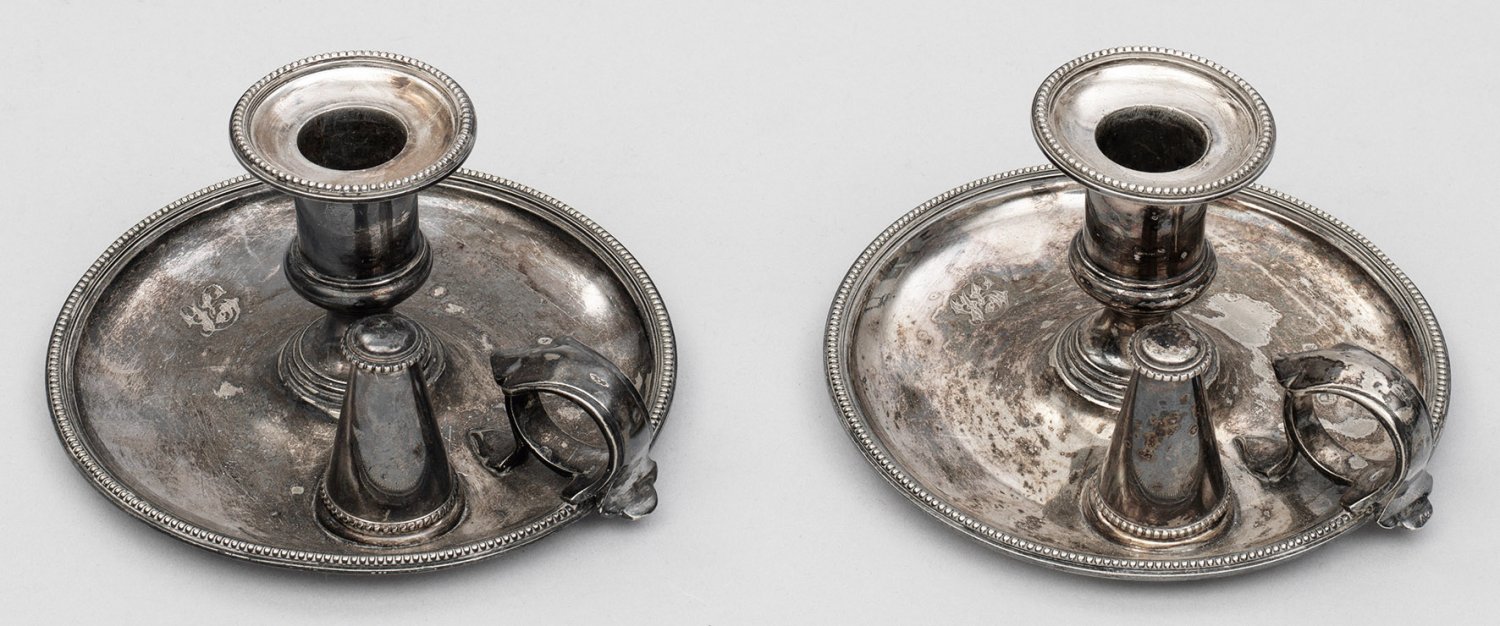 Paar Handleuchter Plated. Vasenförmige Tülle über leicht gemuldetem Stand, akzentuiert von Perlfriesen. Seitliche Wölbung als Halterung für Löschhut. Ringgriff. Gem., Herstellerzeichen. H. 8 cm.