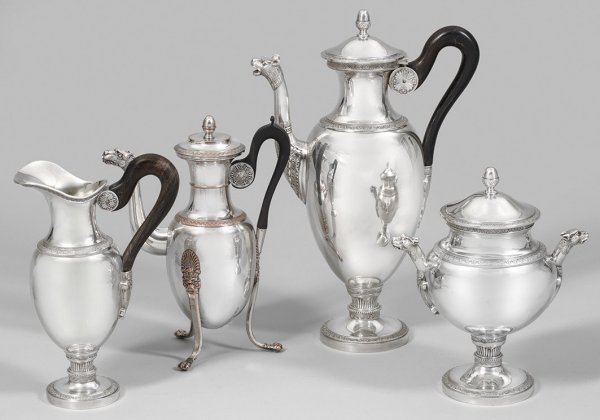 Prachtvoller Kaffee- und Tee-Servicekern im Empirestil Versilbert, teilvergoldet. Glatter Korpus, verziert mit Palmettfriesen, Ausguss und Handhaben als plastische Tierköpfe. Henkel ebonisiert. Gest. "Fallon", Modellnummer. Minim. Gebrauchsspuren. H. 23,5 cm - 37 cm.