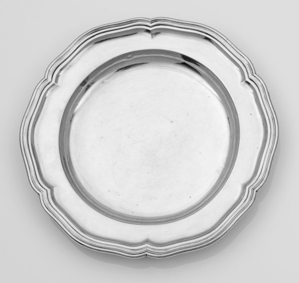 Großer Teller Silber. Gering vertiefter, glatter Spiegel, übergehend in breite Fahne. Blütenförmig geschweifter, mehrfach profilierter Rand. Modell Chippendale. Gest. 800, Herstellerzeichen mit "A. Freitag". Minim. Gebrauchsspuren. Gew. ca. 573 g. D. 28,5 cm.