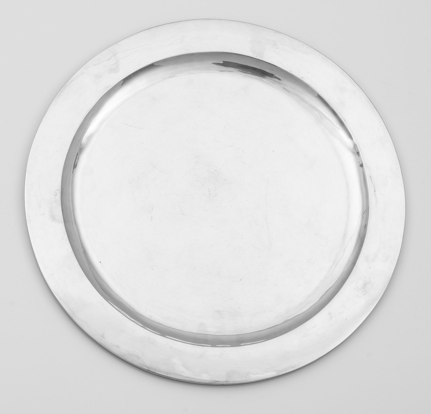 Rundes Tablett Silber. Runde, schlichte und glatte Form mit leicht ansteigendem Spiegel und breiter Fahne. Gest. 925, Herstellerzeichen. Minim. Gebrauchsspuren. Gew. ca. 740 g. D. 34,5 cm.
