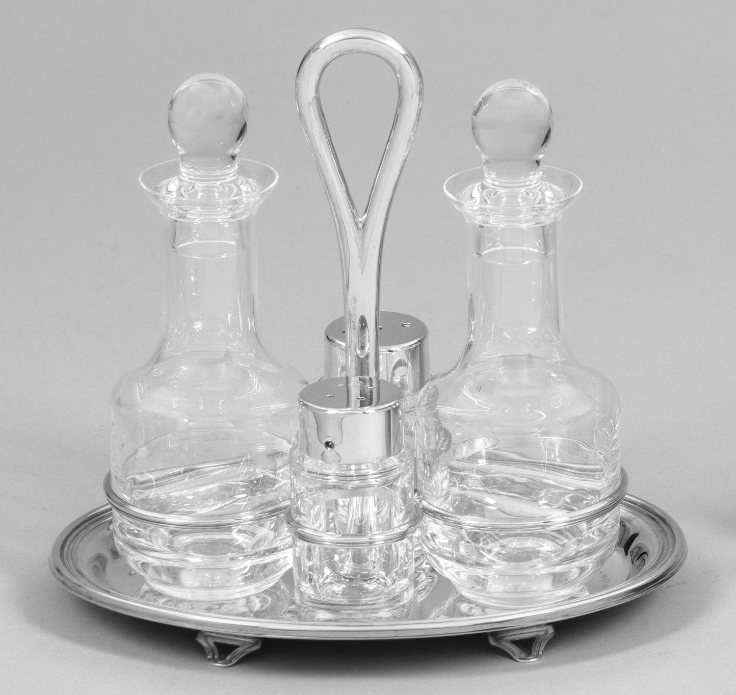 Menage Silber. 5-tlg.; Ovaler Stand mit profiliertem Rand, mittig aufsteigender, ovaler Griff. Unterhalb vier Halteringe für Essig- und Ölflasche sowie Pfeffer- und Salzstreuer aus farblosem Glas, teilw. mit Silbermontierung. Gest. 925 bzw. 800, Herstellerzeichen. H. 20 cm.