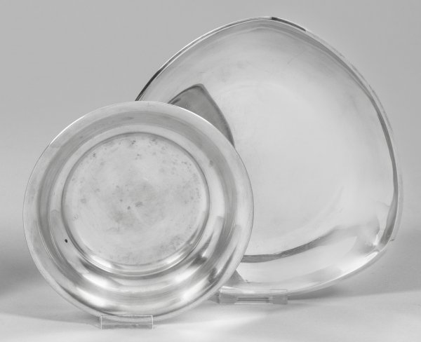 Zwei Anbietschalen Silber. Dreieckig, mit nach oben gezogenen, gerundeten und leicht ausschwingenden Ecken und runder, gemuldeter Form.