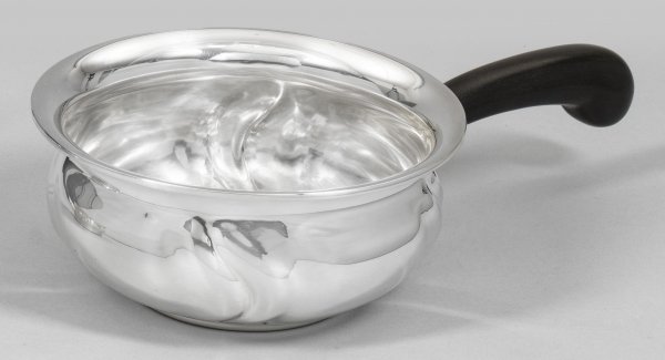 Kasserole Silber. Bauchiger, sich nach oben erweiternder Korpus mit ausgestelltem Rand. Wandung von geschweiften und wellenförmigen Zügen gegliedert. Gerundeter, konischer Griff aus Ebenholz. Gest. 925. Herstellerzeichen. Gew. ca. 684 g. H. 8,5 cm. D. 19 cm.