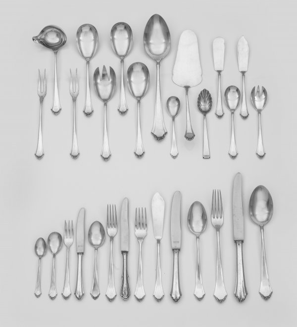 Speisebesteck für sechs Personen Silber, 129-tlg.; 9 Menümesser, 10 -gabeln, 8 -löffel, 12 Speise-, 12 Fischmesser, 11 -gabeln, 12 Dessertmesser, 9 -gabeln, 10 -löffel, 4 Kaffee-, 6 Mokkalöffel, 11 Kuchengabeln, 15 Vorlegeteile (Saucenkelle, Buttermesser, Salatbesteck, Aufschnittgabel, etc.). Schmale facettierte Griffe mit breitem, flachem Heft. Heft am Rand mit reliefplastischen Voluten verziert. Gest. 925. Gebrauchsspuren. Gew. zus. ca. 4070 g (ohne Messer).