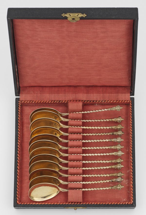 Jugendstil-Eislöffel Silber, vergoldet. 12-tlg.; Vom reliefplastischen Ansatz in Form eines Kopfes übergehend in kannelierten, gewundenen Griff. Gest. 800, Herstellerzeichen. Gew. zus. ca. 221 g. L. 13,3 cm.