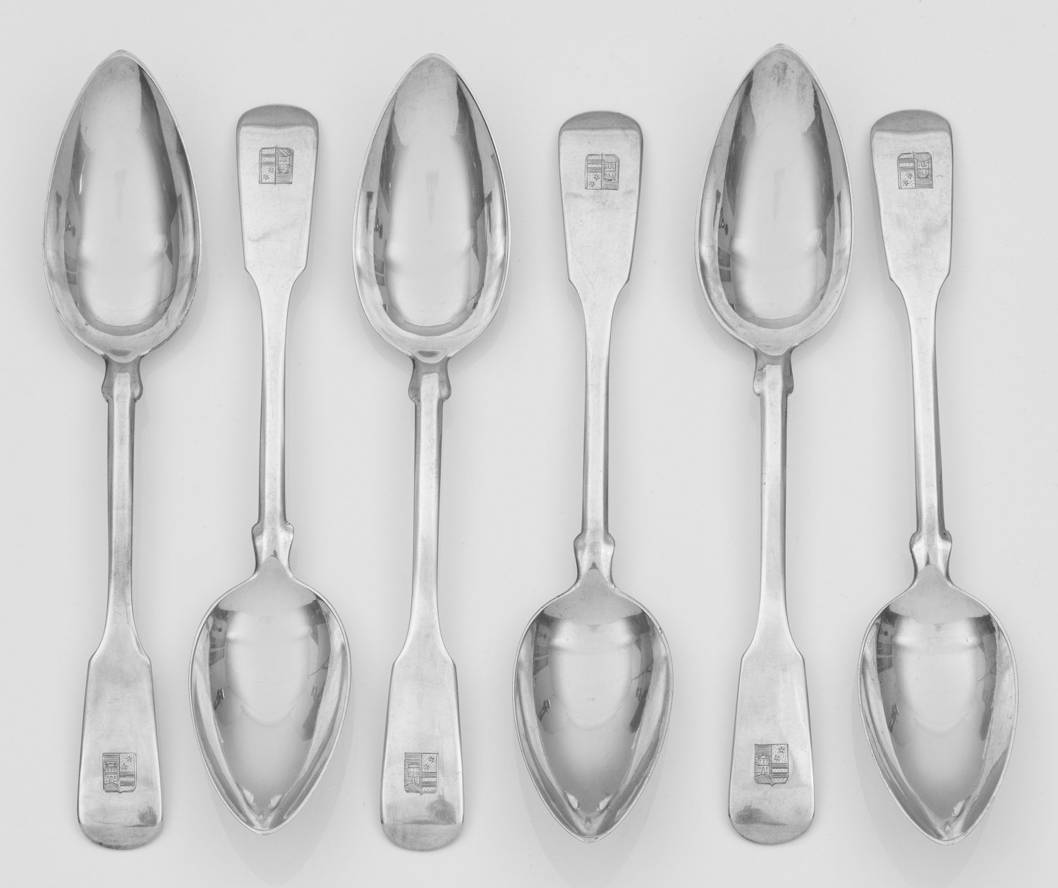Sechs Speiselöffel Silber. Spitz zulaufende Laffe, übergehend in profilierten Griff mit spatenförmigem Heft. Auf dem Heft ein graviertes Wappen. Gest. 800, Herstellerzeichen mit H. Becker. Gew. zus. ca. 360 g. L. 22,5 cm.