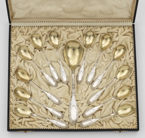 Dessertbesteck Silber, teilw. vergoldet. 13-tlg.; Vorlegelöffel und 12 Eislöffel. Ovoide, glatte Laffe. Sich konisch erweiternder, gerippter Griff, übergehend in ein mit Lorbeer reliefiertes Heft. Gest. 800, Herstellerzeichen. Im Originaletui. Gew. zus. ca. 348 g. L. 14 cm - 21,5 cm.