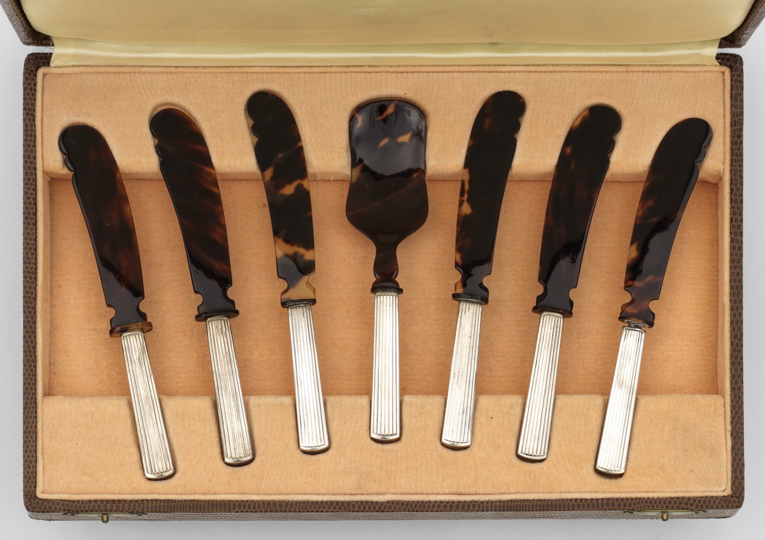 Kaviarbesteck in Original-Etui. 7-tlg.; Kaviarlöffel und 6 -messer. Profilierter, gekanteter Griff. Schneide bzw. Laffe aus Schildpatt. Gest. 925. L. 14 cm - 14,5 cm.