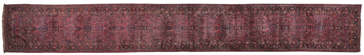Überlange antike Keschan-Galerie Persien. Um 1920. Wolle auf Baumwolle. Im roten Innenfeld flächendeckend dichte Musterung aus arabesk angeordneten Blütenranken und Rispen. Umlaufend schmale, dunkelblaue Rosettenbordüre. Secrilit-Schutzurkunde von 1984. 600 cm x 83 cm.