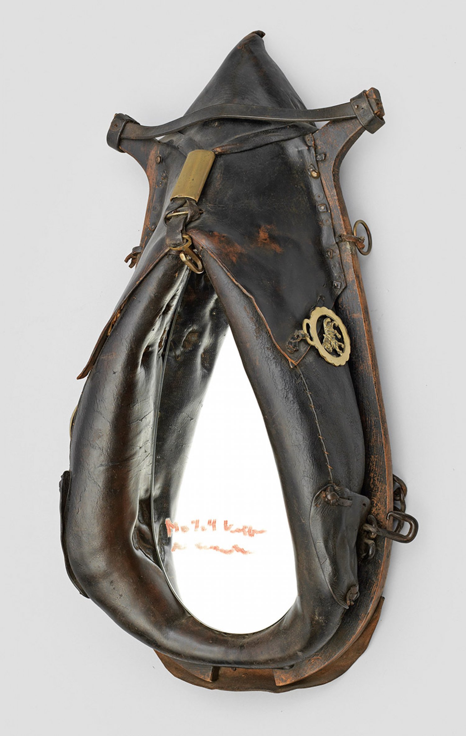 Rustikaler Wandspiegel Leder und Holz, mit schön gewachsener Patina. Breite, weit vorkragende und spitz zulaufende Spiegelrahmung aus einem historischen Pferde-Kummet. Teilw. durchbrochen gearbeitete Zierelemente aus Messing sowie eingesetzte Spiegelfläche. 100 cm x 50 cm.