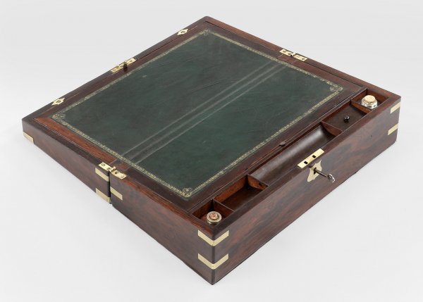 Regency-Schreibschatulle Palisander, furniert. Gerader, rechteckiger, aufklappbarer Korpus mit eingelegten Ecken aus Messing. Innen schräggestellte, aufklappbare Arbeitsfläche aus grünem, goldgeprägtem Leder sowie oberhalb Facheinteilung und Glaseinsätze. H. 15,5 cm. 50 cm x 25 cm bzw. H. 11 cm. 50 cm x 51 cm.