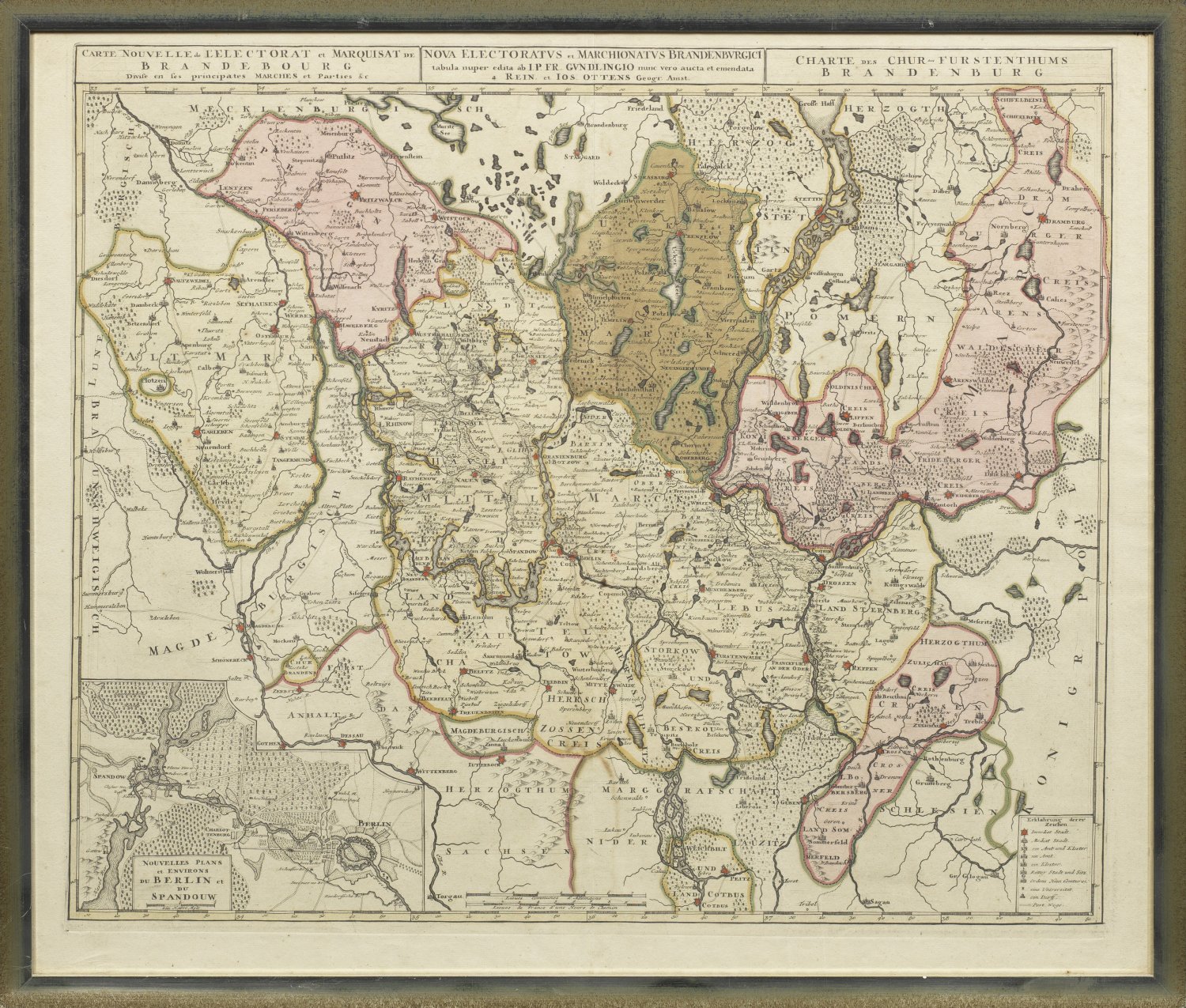 Altkolorierte Kupferstich-Karte, erschienen bei R. und J. Ottens, Amsterdam, um 1740. Die Darstellung reicht von der Müritz bis Cottbus, zeigt die Alt- und Neumark. L. u. Umgebungskarte von Berlin, deren Bedeutung in der ersten gedruckten Darstellung der begonnenen Erweiterung der Friedrichstadt liegt. Plattenmaß ca. 50,2 cm x 59 cm. Rahmen.