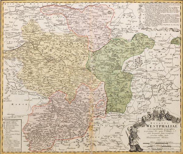 Flächenkolorierte, detailreiche Kupferstichkarte des Herzogtums Westfalen, erschienen bei Homann Erben, Nürnberg, dat. 1757. Das Herzogtum gehörte bis 1803 zum Kurfürstentum Köln; Clemens August I. von Bayern war von 1723 bis 1761 für fast vier Jahrzehnte Landesherr. Plattenmaß ca. 48,5 cm x 57 cm. Rahmen.