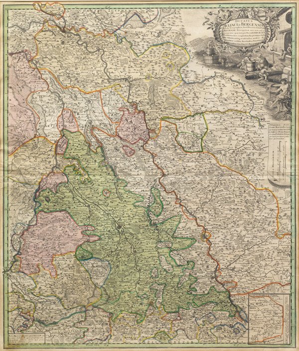 "Ducatus Juliaci & Bergensis (...)". Originaltitel Altkolorierte, dekorative Kupferstichkarte, erschienen bei Homann Erben, Nürnberg, um 1739-1750. Mit figürlicher Titelkartusche. Zeigt detailreich die Herzogtümer Jülich und Berg, Kleve und die Grafschaft Moers, r. u. Insetkarte von Wildenberg. 58,5 cm x 48,5 cm (Passepartoutausschnitt). Rahmen.
