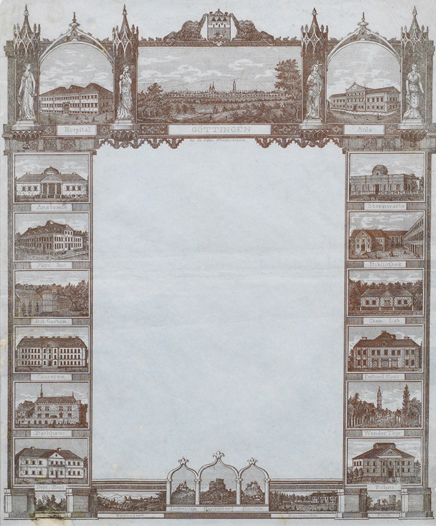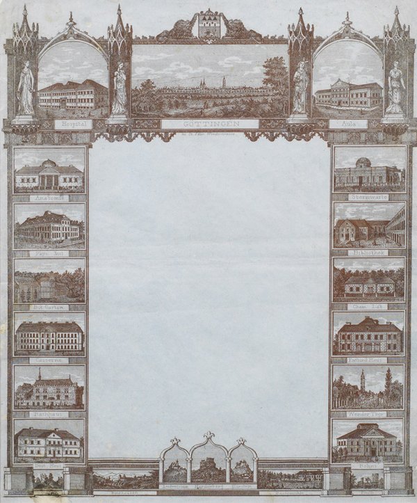 Seltener neogotischer Briefbogen mit Göttingen-Ansichten Stahlstich/hellblaugraues Papier. Erschienen bei Ch. Edler, We(e)nder Straße, Göttingen, um 1830-1850. Das Blatt zeigt eine Vielzahl von Ansichten von Göttingen und Destinationen in der Umgebung. Ger. fleckig. Ca. 27,5 cm x 22,5 cm (Passepartoutausschnitt). Rahmen.