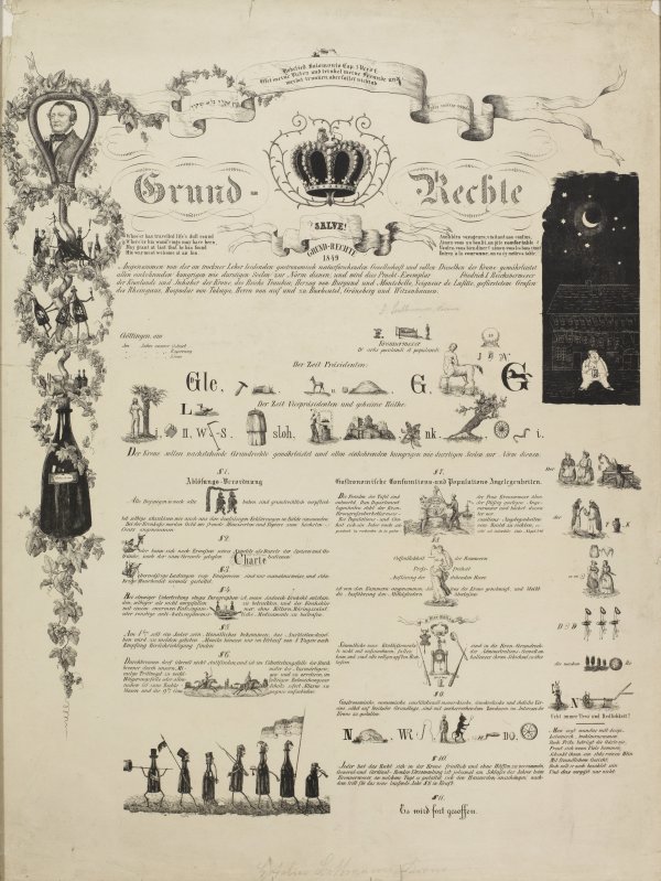 "Grund-Rechte" des Hotels "Zur Krone" in Göttingen 1849 Lithographie/Papier. Das rare, scherzhafte Blatt ist eine satirische Anspielung auf die "Grundrechte des deutschen Volkes" von 1848/49. Diese wohl vom Inhaber des Hotels Fritz Bettmann (1824 - 1875) selbst in Auftrag gegebene Grafik setzt diese in Darstellungen, Texten und Paragraphen zum Bier- und Weingenuss um; auf der linken Seite ein Porträt Bettmanns, rechts eine Ansicht mit Zecher. Bez. "F. Bettmann, Krone" bzw. "Hotelier Bettmann, Krone". Ger. Randeinrisse und -läsuren. Ca. 66,5 cm x 51,5 cm. Rahmen.