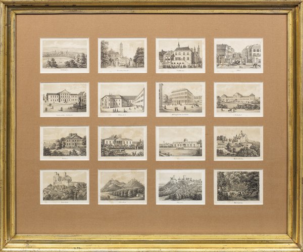 16 kleinformatige Lithographien mit Ansichten von Plätzen und Gebäuden in Göttingen und der näheren Umgebung sowie den Burgen Hanstein, Gleichen, Plesse und Hardenberg. Plattenmaß 57 cm x 72 cm. Passepartoutausschnitt je 9,3 cm x 13 cm. Rahmen.