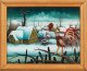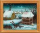 Paar Winterlandschaften mit Pflug im Schnee und krähendem Hahn vor Dorfhintergrund
