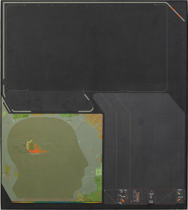 Mit sehr feinem, fast technokratisch gelenktem Pinsel entsteht auf anthrazitfarbener Oberfläche - ausgehend von einer Männerkopfsilhouette - ein beschrifteter Schaltplan mit Ziffern, Linien und Schaltern. Unter dem Eindruck der beginnenden Proteste gegen den Vietnamkrieg, befasste sich Wittenborn in seiner Serie "Military Offers" mit dem wie Armin Zweite es nannte "sich immer mehr verselbstständigenden Mechanismus von Produktion und Einsatz elektronisch gesteuerter Waffensysteme". Seit 1970er Jahren Teilnahme an internationalen Einzel- und Gruppenausstellungen u. a. in Genua (2000), New York (1995), Documenta 6 und Kunstvereine Münster (1977). Acryl/Lwd.; bez. recto, verso dat. 14(19)69. 150 cm x 135 cm.