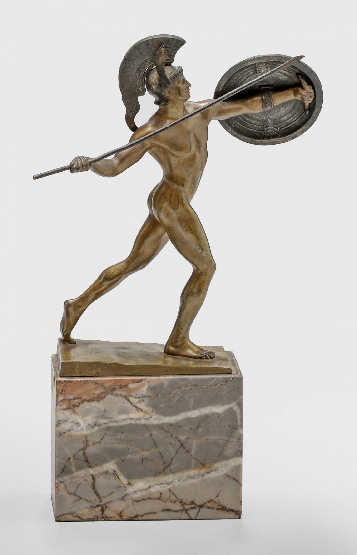 Bronze, goldbraun patiniert. Sign. in der Plinthe. Rot-grauer Marmorsockel. Aktfigur des trojanischen Kriegers mit Schild und Speer. Ges.-H. 25 cm.
