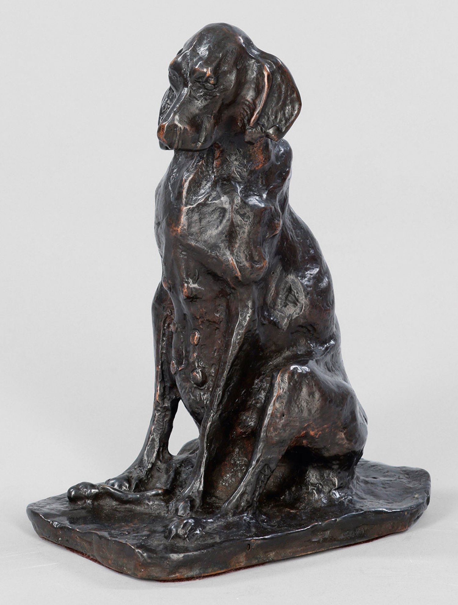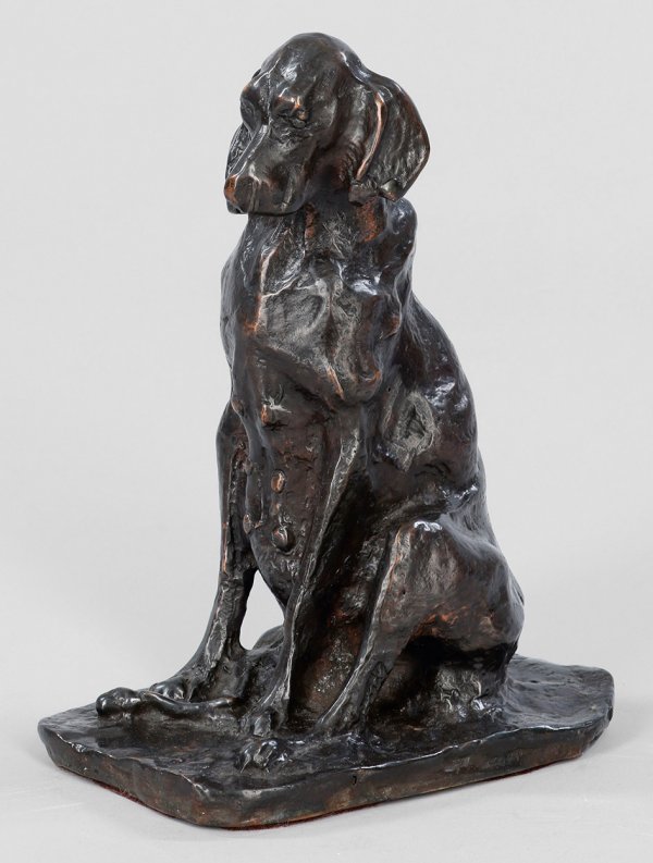 Bronze, dunkel patiniert. Künstler-Bez.; Posthumer Guss, Ende 20./Anfang 21. Jh.; Der impressionistische, von Auguste Rodin und Rembrandt Bugatti inspirierte Bildhauer widmete sich sowohl menschlichen Figuren und Porträts als auch Tierdarstellungen, insbesondere von Hunden. 1886 debütierte Troubetzkoy in einer Ausstellung der Brera-Akademie in Mailand, 1893 und 1900 beschickte er die Weltausstellungen in Chicago und Paris. H. 22,5 cm.