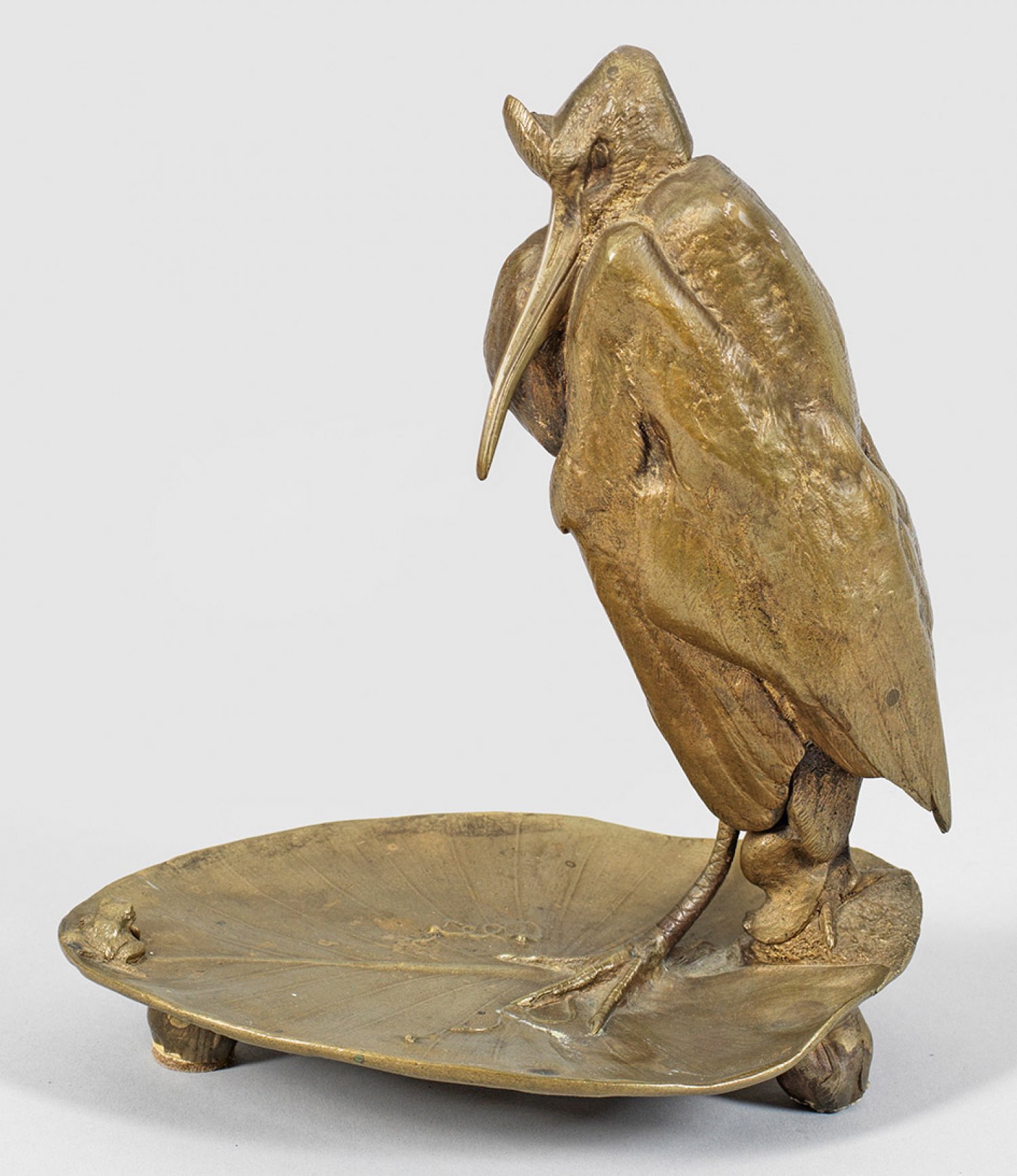 Bronze, goldbraun patiniert. Sign.; Figural gestaltetes Jugendstil-Objekt als Visitenkartenschale. Der bedeutende Tierbildhauer, der durch die naturnahe Lebendigkeit seiner Darstellungen herausragt, stellte ab 1846 vielfach aus und beschickte u. a. die Weltausstellung 1878. H. 21 cm.