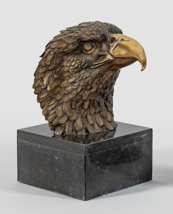 Bronze, braun und grün patiniert, teilw. poliert. Sign. "Milo". Dunkelgrauer Steinsockel. Vollplastische, naturnahe Darstellung mit detailreicher Wiedergabe des Gefieders. Ges.-H. 30 cm.