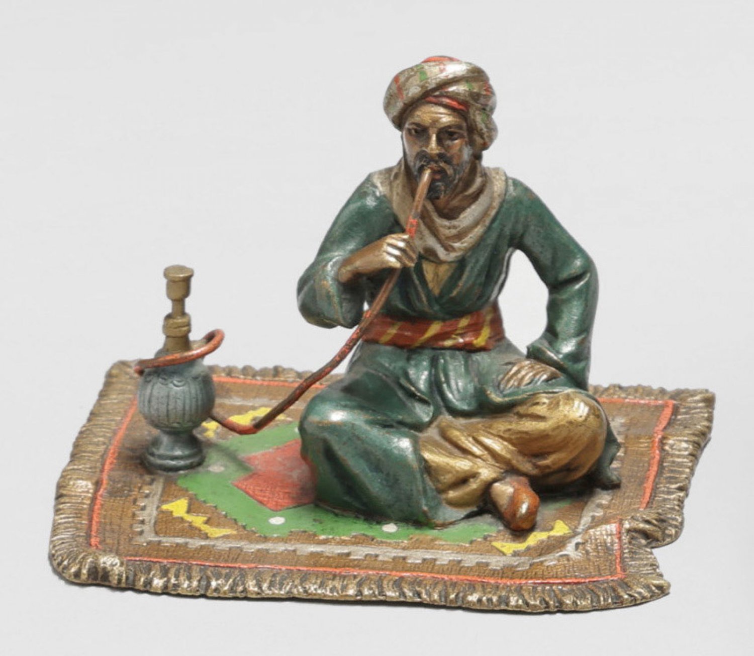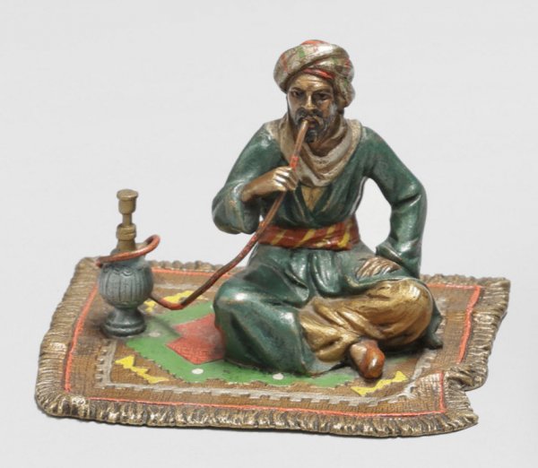 Araber mit Wasserpfeife Wiener Bronze, farbig gefasst. Auf einer Bodenplatte im Aussehen eines Orientteppichs mit Faltenwurf sitzt ein bärtiger Araber mit Turban und grünem Mantel. Aus der beliebten Reihe der sog. Araber- bzw. Teppichbronzen. Vollplastische, naturgetreue Figurendarstellung. H. 6,5 cm.