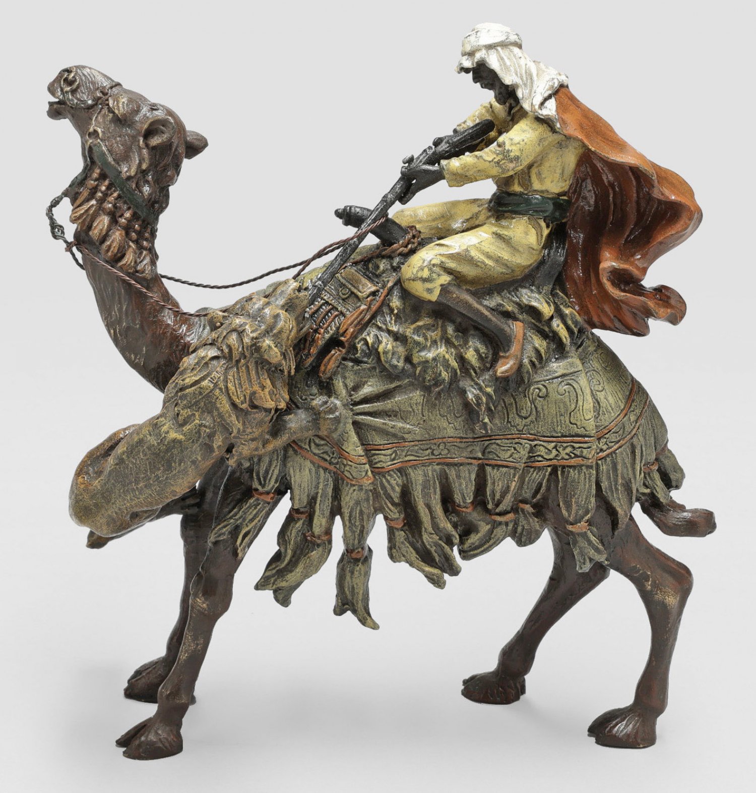 Auf einem Kamel reitender Araber im Kampf mit einem Löwen Bronze, dunkelbraun patiniert und poychrom bemalt. Vollplastische, detailreiche Darstellung in der Tradition der Wiener Araber-Bronzen der Fa. Bergmann. H. 17 cm.
