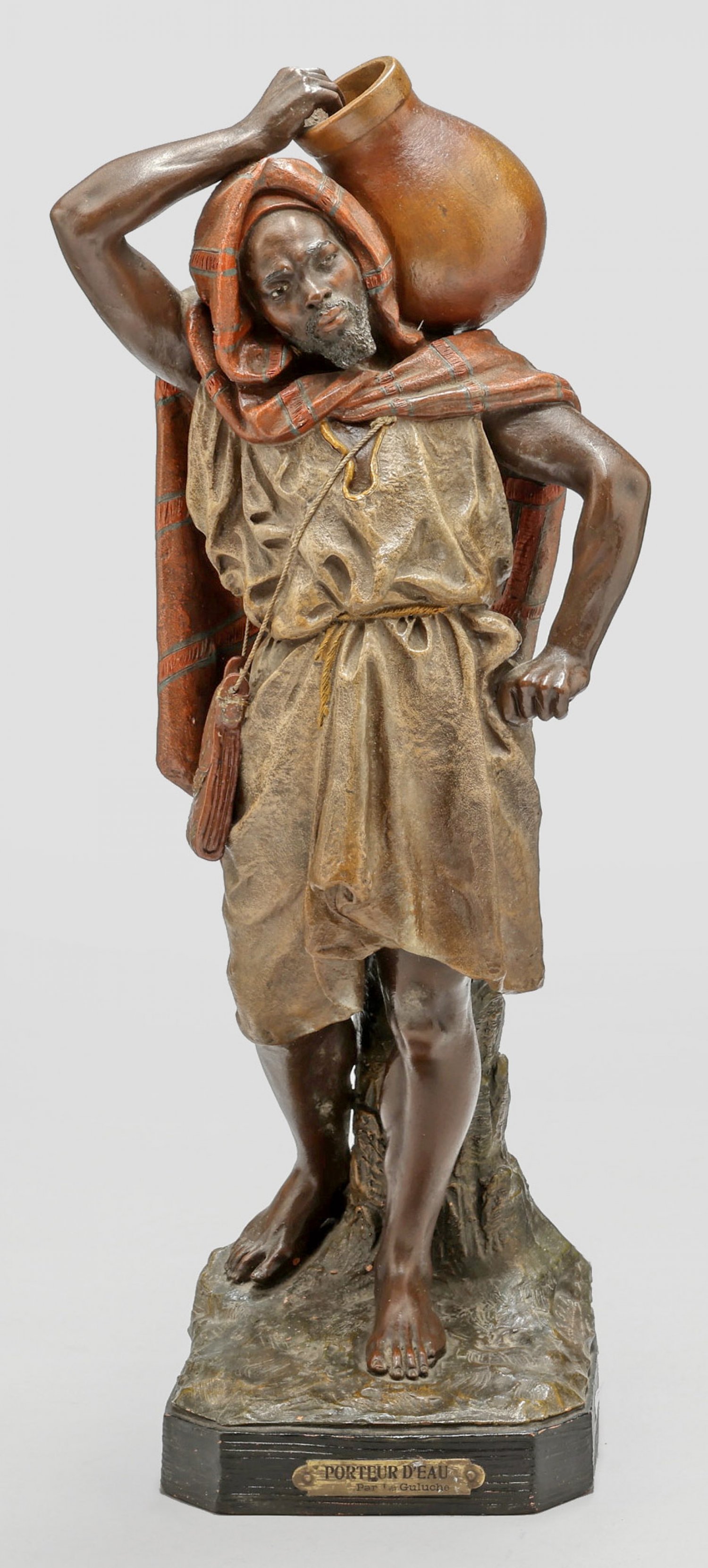 Polychrome slipped and painted terracotta figure of a North African water carrier. Signed. Titled and inscribed on original plaque. Manufacturer's mark of Fontaine & Dureux, Paris, model-no. 329.