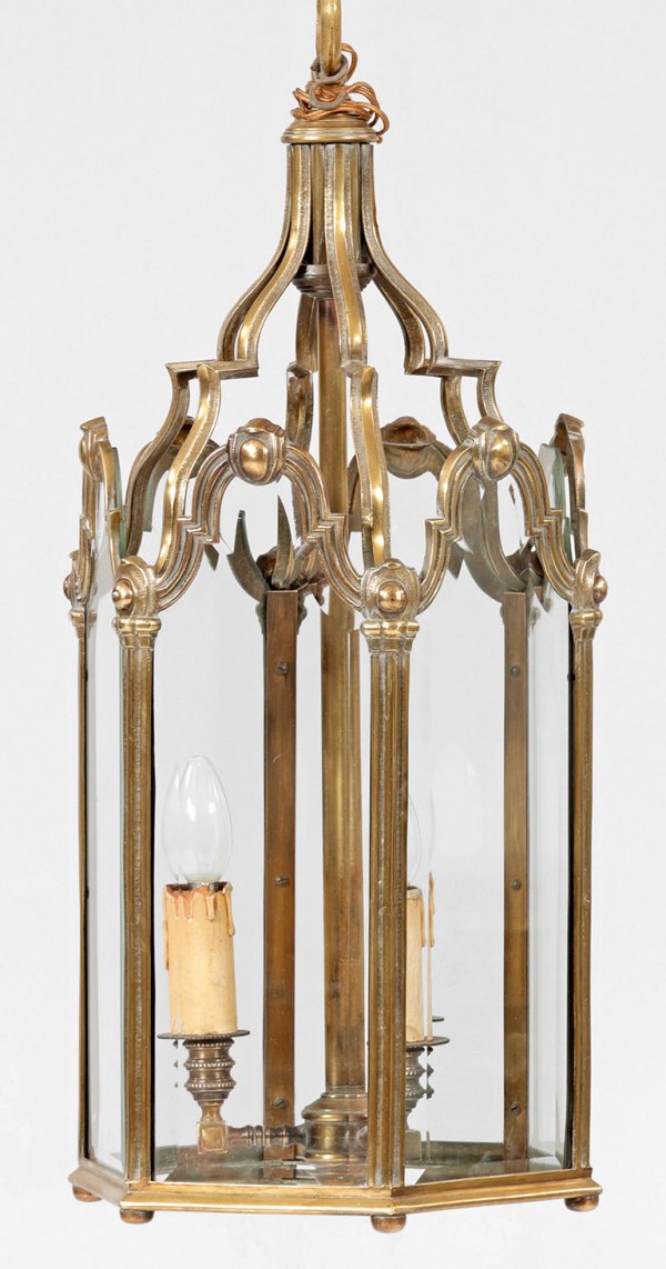 Deckenampel 3-flg.; Bronze und farbloses, facettiertes Glas. Hexagonaler Korpus auf profilierten Streben mit geschweift ansteigenden Volutenmotiven sowie hoch aufgeworfener oberer Abschluss aus korrespondierenden Stegen. In der Mitte schlanker Schaft als Träger für Leuchtmittel. Elektrifiziert. H. 71 cm. D. 28 cm.