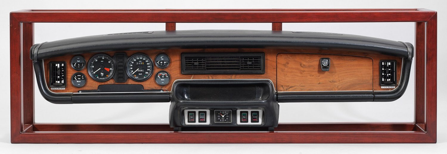Jaguar XJ12-Amaturenbrett Nussbaum, furniert sowie schwarzer Kunststoff. Organisch geformter Korpus mit zentraler Ablage, Lüftungsschlitzen unterschiedlicher Größe, entsprechenden Bedienknöpfen und Quarzuhr sowie Messinstrumente für Tempo und Drehzahl sowie unterschiedliche Anzeigen für Kühlwasser, Öldruck und Batterie. Handschuhfach mit aufstellbarem Spiegel. Mahagonifarben gebeiztes Holzgestell. Armaturenbrett-L. 138 cm.