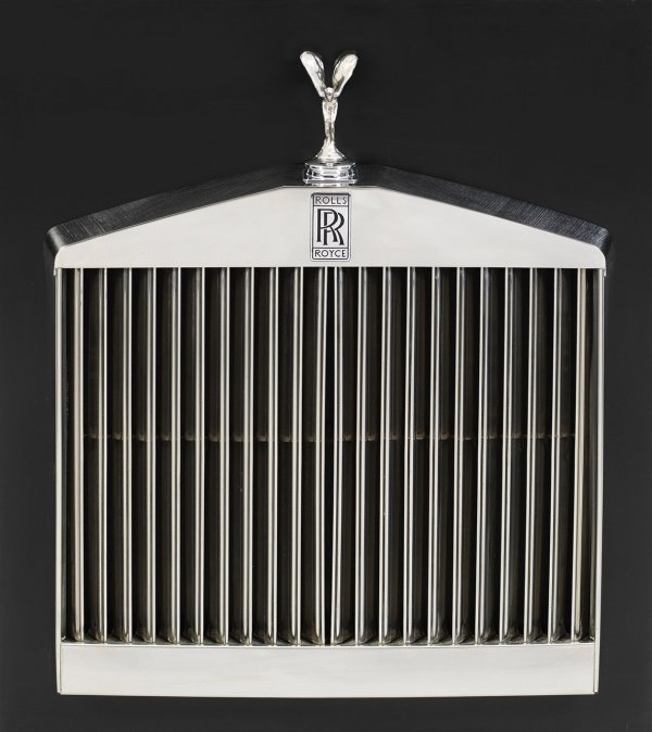 Rolls-Royce-Kühlergrill Stahlblech, verchromt. Rechteckiger Korpus aus schräggestellten Lamellen sowie schräg ansteigendem oberen Abschluss mit Herstellerzeichen. Oberhalb vollplastisch gestaltete Kühlerfigur "Spirit of Ecstasy", der sog. Emily, nach einem Entwurf von Charles Robert Sykes. 66 cm x 60 cm. Auf schwarz lackierte Holzplatte montiert.