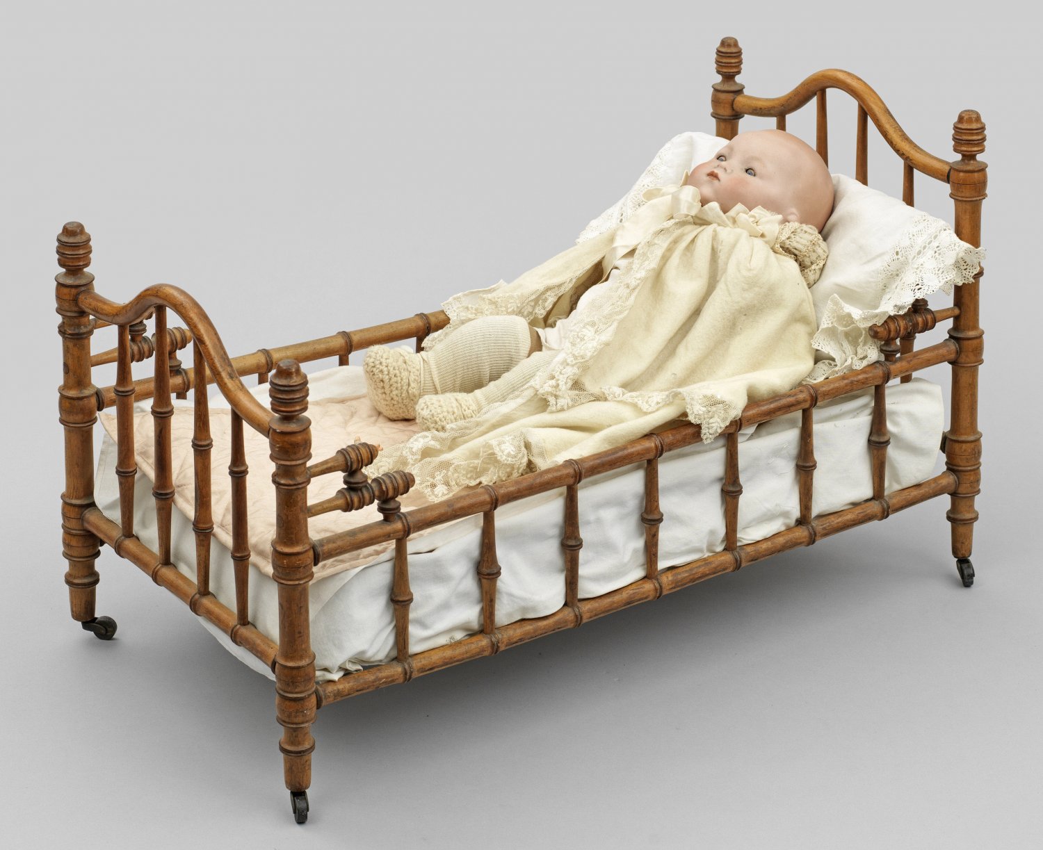 A biscuit head doll by Armand Marseille with beechwood doll's bed.