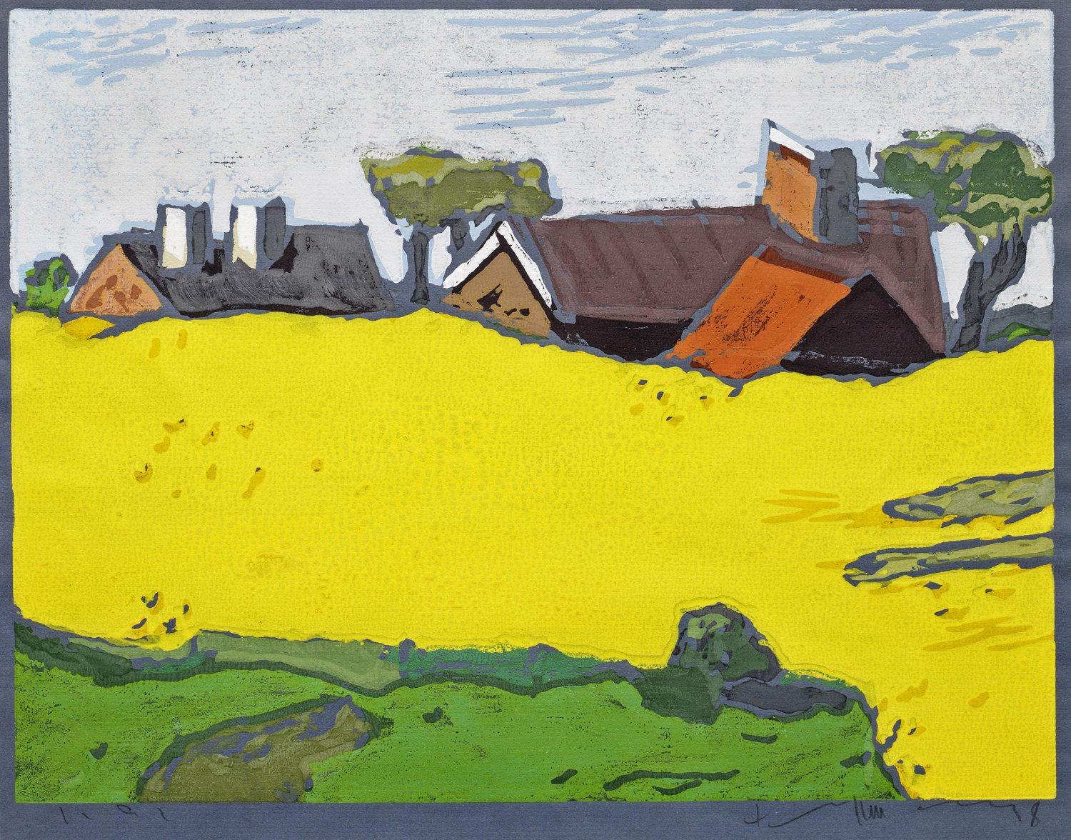 Farblinolschnitt/graues Papier, 1998. Sign. u. dat.; E. A.-Abzug. Wvz. Nr. 421. Das großformatige, leuchtend farbige, flächig komponierte Blatt, das die norddeutsche Landschaft in Schleswig-Holstein mit der Raps-Blüte im Mai schildert, gehört zu den schönsten im grafischen Oeuvre des Künstlers. Darstellung ca. 42 cm x 55 cm; Blatt ca. 48 cm x 60 cm Rahmen.