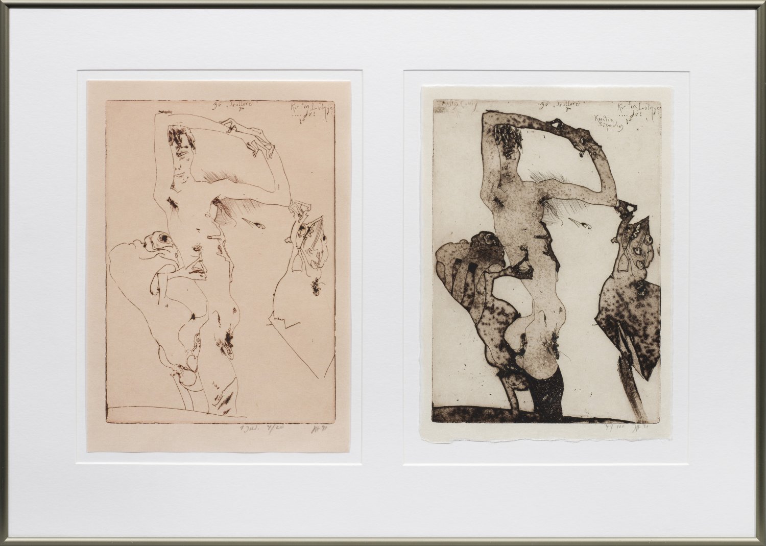 Radierung bzw. Radierung u. Aquatinta, 1991. Jeweils sign. u. dat.; Ein Abzug des 1. Zustandes mit korrespondierender Bez. auf apricotfarbenem Papier, nummeriert 4/20; ein Abzug des letzten Zustandes nummeriert 4/100. Oberhalb in der Platte unterschiedliche Annotationen. Plattenmaß ca. 29,5 cm x 21 cm; Blatt ca. 32,5 cm-34 cm x 23 cm-24 cm. In Sammel-Rahmen.