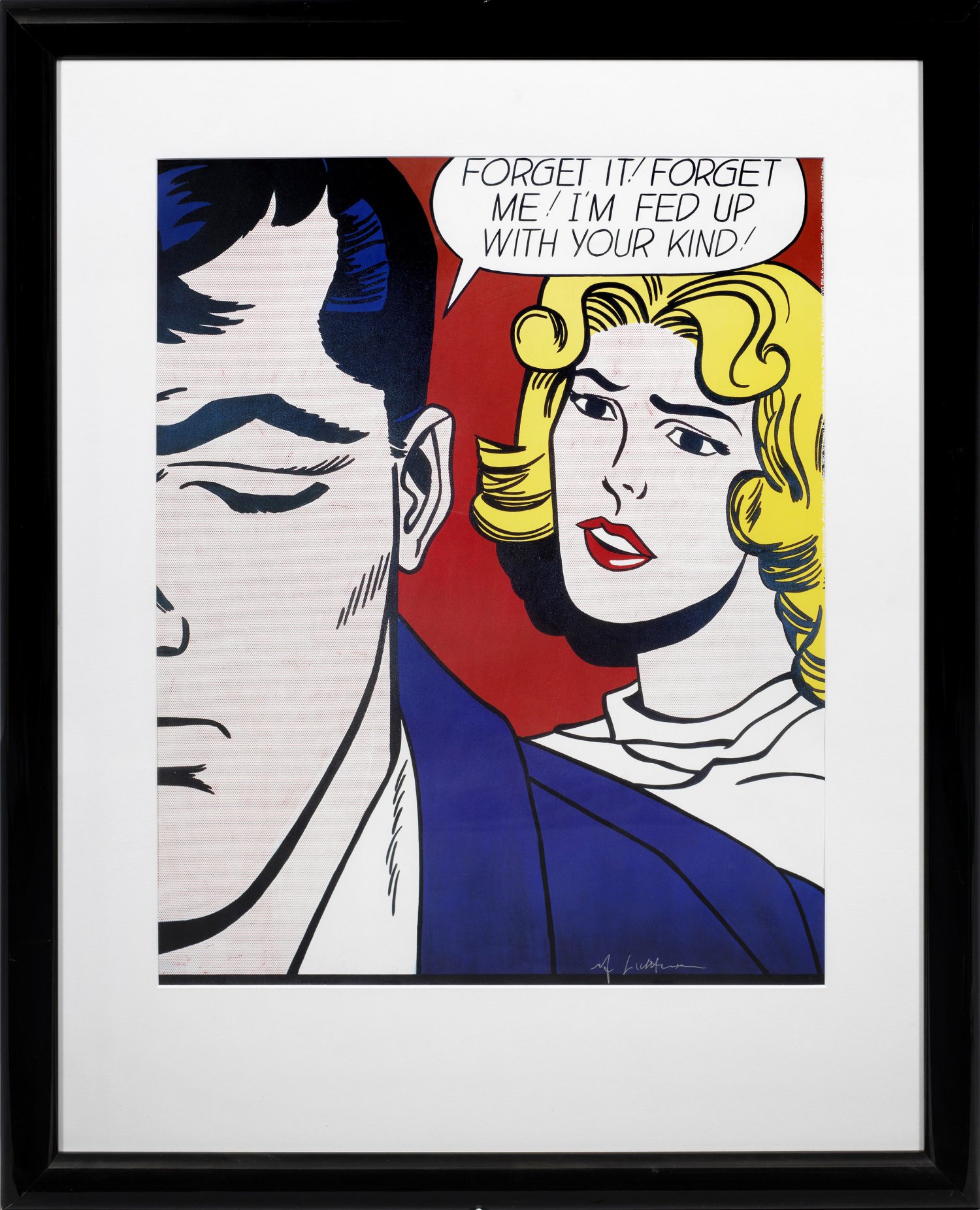 Farboffset/Papier, 1995. Plakat zur Roy Lichtenstein-Ausstellung in den Deichtorhallen, Hamburg, unter Verwendung des gleichnamigen Gemäldes von 1964, gestaltet mit Panhans/Zander. Mit Gefälligkeits-Sign. von Roy Lichtenstein. Am rechten Rand typographisch bez.; 70 cm x 57,5 cm (Passepartoutausschnitt). Rahmen.