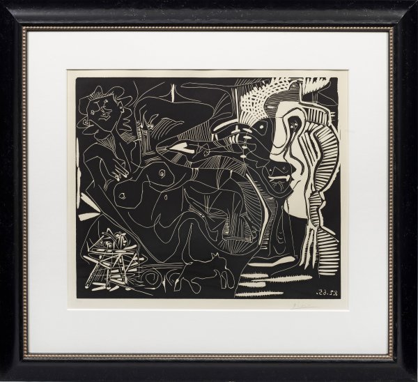 Linolschnitt/Arches, 1965. Sign. u. nummeriert 36/50 (es gab überdies noch fünf Künstler-Abzüge). R. u. spiegelbildlich im Druck dat. "8.5.(19)65". Hrsg. Galerie Louise Leiris, Paris. Wvz. Bloch 1851, Baer 1358. Der in sattem, dominierendem Schwarz ausgeführte Linolschnitt spiegelt Picassos große Meisterschaft in diesem Druckmedium wider. Die Komposition zeigt zwei unbekleidete Frauen, von denen eine auf der linken Seite ruht, während die andere mit großem Profilkopf die rechte Bildseite ausfüllt. Im linken Bildviertel sind die im Titel angegebene Katze und der Teetisch umrissen. Picasso verwendete wirbelnde Linien im Kontrast zu scharfen Winkeln, um in der Fläche ein komplexes Geflecht voller Energie und Texturen zu schaffen. Als ein Pionier auf dem Gebiet der Druckgrafik setzte er die Techniken auf neue und ungewöhnliche Weise um, um zuvor noch nie so gesehene Linolschnitte, Lithographien, Radierungen und Aquatintablätter zu schaffen. Darstellung ca. 52,7 cm x 63,8 cm. Rahmen.