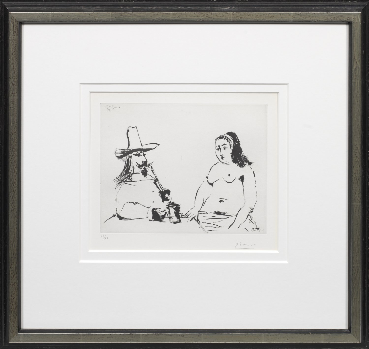 Aquatintaradierung/Velin, 1968. Sign. in Bleistift u. nummeriert 38/50. In der Platte spiegelbildlich dat. 26.9.(19)68 IV". Wvz. Bloch 1819; Baer 1836Bb1. Drucker Aldo and Piero Crommelynck, Hrsg. Galerie Louise Leiris, Paris. Szenische Darstellung eines am Tisch sitzenden Musketiers mit Pfeife, ihm gegenüber ein weiblicher Halbakt. Plattenmaß ca. 20,5 cm x 26,5 cm. Rahmen.
