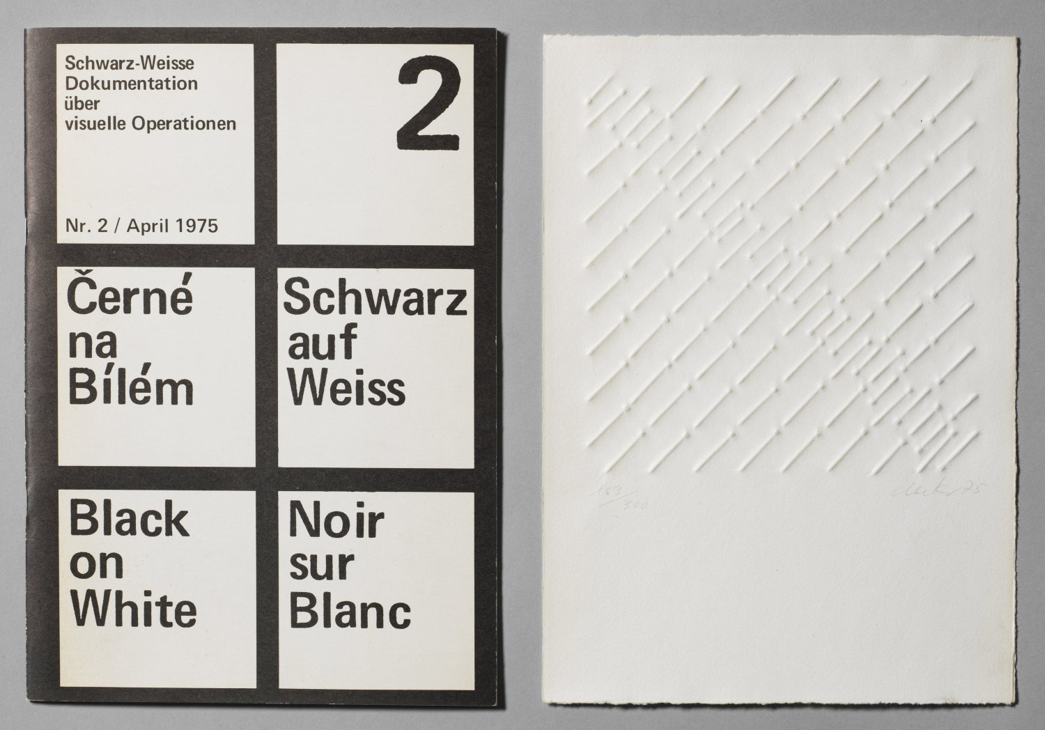 Nagel-Prägedruck, 1975. Sign. u. nummeriert 163/300. Originalgrafische Beilage zu dem seltenen, beigefügten Heft "Cerne na Bilem / Schwarz auf Weiss / Black on White / Noir sur Blanc", "Schwarz-Weisse Dokumentationen über visuelle Operationen", Heft Nr. 2, April 1975, Hrsg. F. Kyncl und F. Spitmann, Privatdruck im Selbstverlag, Düsseldorf, 1975. Blatt ca. 29,2 cm x 21 cm.