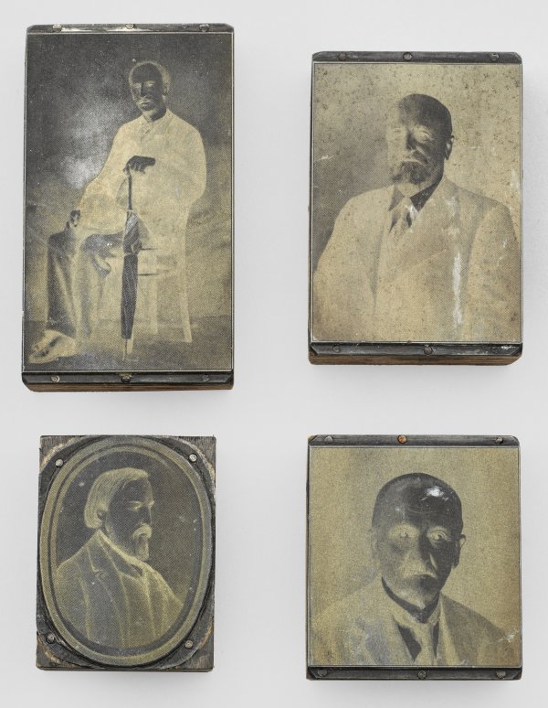 Vier Druckstöcke mit männlichen Porträts