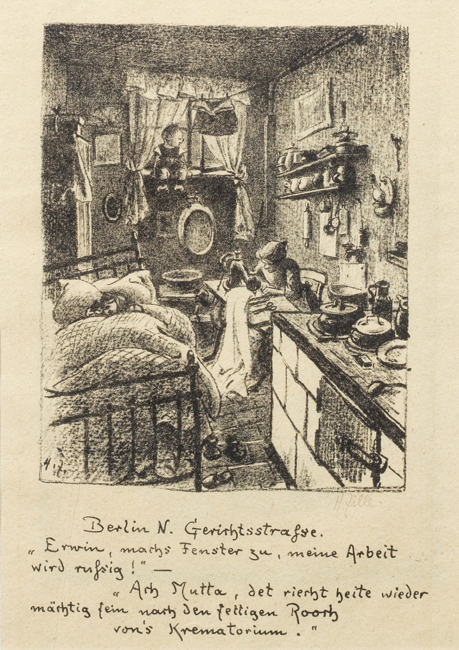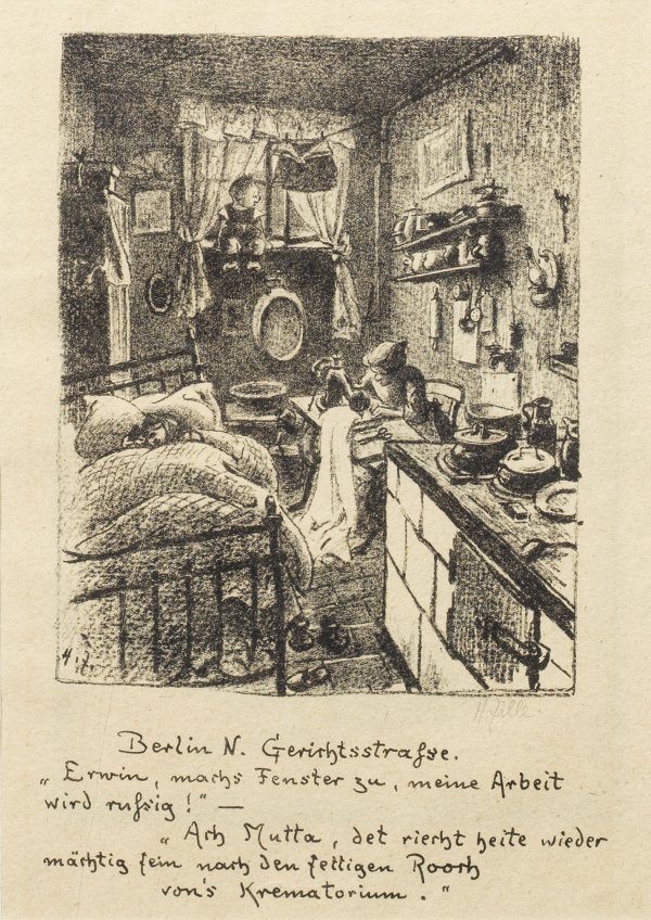 Lithographie/Papier, 1919. Sign., im Stein monogr.; Wvz. Rosenbach 96. Sarkastisches, sozialkritisches Blatt aus der bedeutenden Folge "Zwanglose Geschichten und Bilder". 28,5 cm x 19,5 cm (Passepartoutausschnitt). Rahmen.