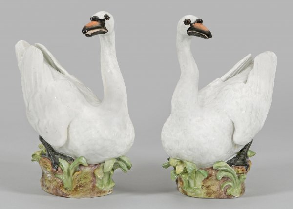Paar Schwanenfiguren Auf naturalistisch staffiertem Sockel zwischen Schilfbüscheln sitzender Schwan mit aufgerichtetem Kopf und naturgetreuem, reliefiertem Gefieder. Polychrome Malerei. Entw. Johann Joachim Kaendler. Modell-Nr. 1069 und 1070. Rest.; Schwertermarke. H. 22 cm.