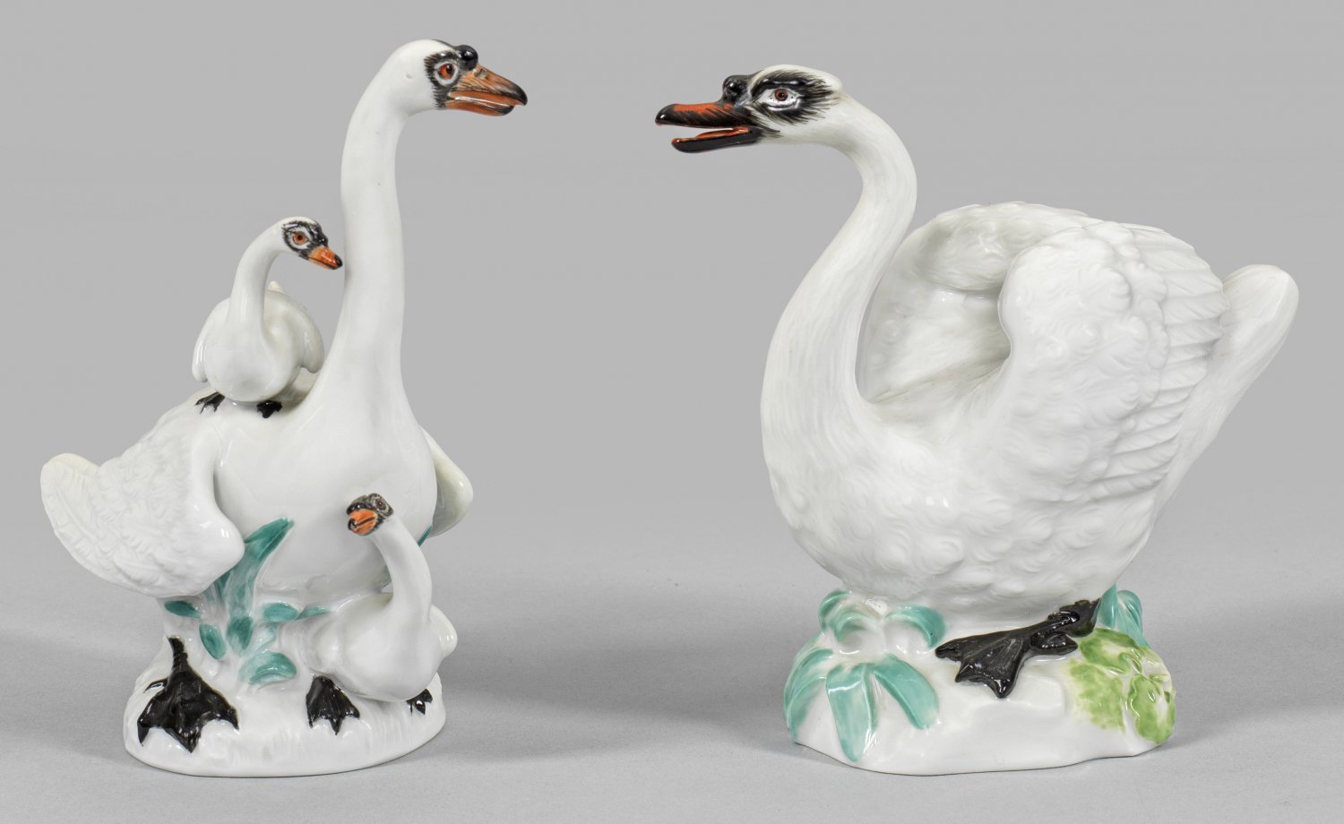 Paar Schwanenfiguren Auf felsigem Sockel sitzender Schwan bzw. Schwanenmutter mit ihren Jungen. Fein reliefiertes Gefieder. Sparsame polychrome Malerei. Entw. wohl Johann Joachim Kaendler und August Ringler. Modell-Nr. 77132 und 214. Schwertermarke. H. 13 cm - 13 5 cm.