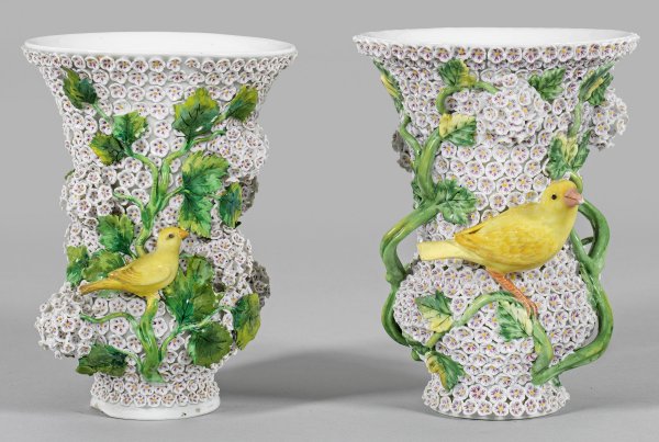Paar Ziervasen mit Schneeballendekor Gedrückt bauchiger Korpus, in sich konisch erweiternden Hals mit ausschwingendem Rand übergehend. Auf der Wandung dichter Fond aus plastisch aufgelegten, einzeln bossierten, purpur-gelb staffierten Schneeballenblüten mit großen Blütendolden, umzogen von stark plastischen, sich verzweigenden Blattranken. Seitlich sitzende Kanarienvögel mit gelbem Gefieder. Polychrome Malerei. Entw. Johann Joachim Kaendler. Unw. best./rest.; Schwertermarke. H. 34 cm.