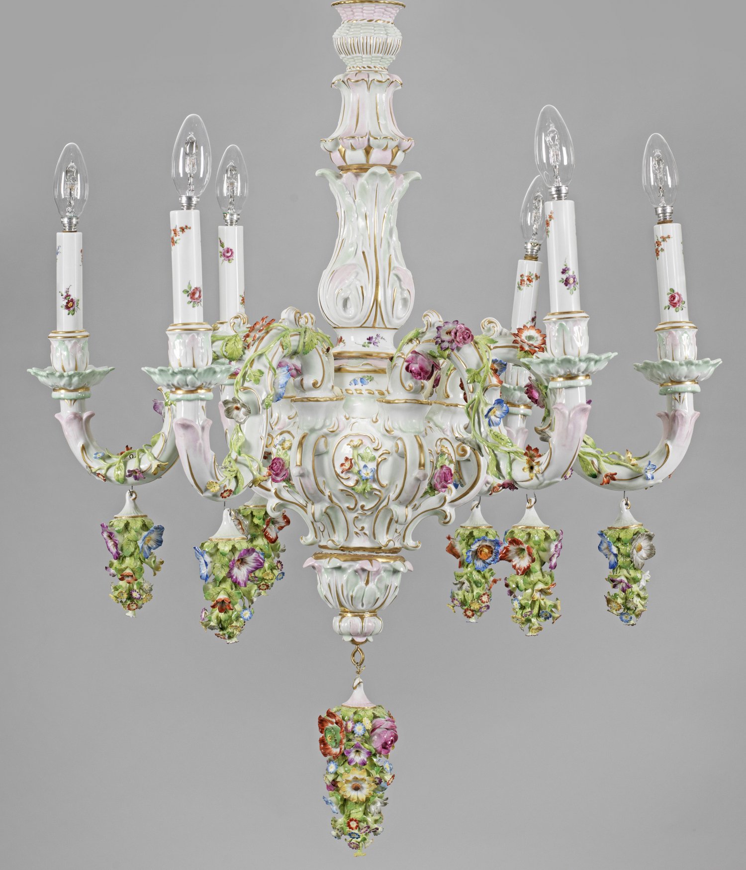 Porzellan-Deckenleuchter mit prächtigem Blumendekor 6-flg.; Balusterförmiger, mehrfach gegliederter Korpus mit bombierter Wandung und gegenläufigen C-Bögen. Sechs abnehmbare, geschweifte Leuchterarme, umzogen von feinen, plastisch aufgelegten Blumenranken, in vasenförmiger Tülle mit zylinderförmigen Abschlüssen und blattartiger Traufschale endend. Umlaufend reliefplastischer, in zartem Seegrün und Rosa staffierter Dekor aus Blatt- und Rocaillenwerk sowie teilw. in Kartuschen gerahmte Blütenzweige, -gebinde und Streublumen. Unterhalb hängende, tropfenförmige Blumenbuketts, arrangiert aus feinmodellierten, sommerlichen Blüten. Polychrome Malerei mit reicher Goldstaffage. Entw. Ernst August Leuteritz. Elektrifiziert. Schaft-H. ca. 60 cm. D. ca. 67 cm.